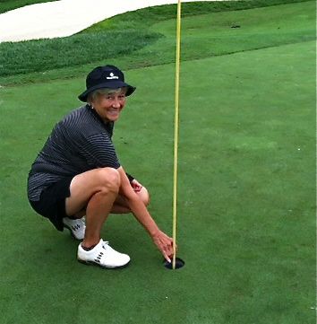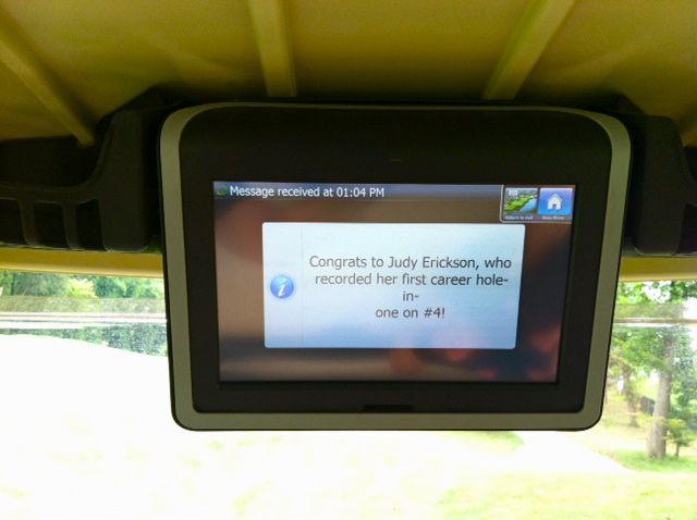 Congratulations to Judy Erickson for a hole-in-one today at Lake Presidential Golf Course in Maryland, on hole 4, a 100 yard par 3. She was playing in an Arlington Seniors foursome with Jane Barnes, Shirley McKinley and Sally Reams. She quickly attained celebrity status at the golf course. By hole 10 her achievement was broadcasted to everyone on the course via the GPS screen in each golf cart (photos below). At hole 14 she was stopped by a photographer, and on hole 17 the marshall wanted to know if she was buying everyone a beer afterwards! You can send your congratulations to Judy at judyerickson39@gmail.com or get her autograph 🙂 on Thursday at the shotgun luncheon!